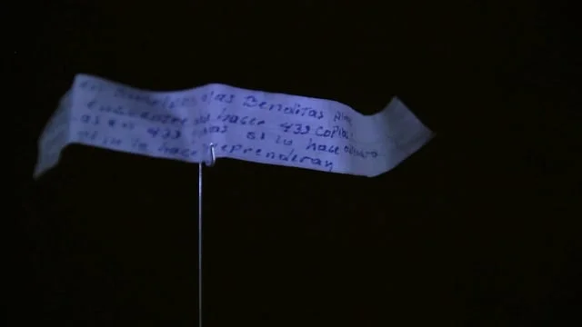 Como parte del proyecto Lo que existe, lo que no existe, recolecté evidencias de prácticas funerarias que existieran en los márgenes de aquellas instituidas dentro del Cementerio Central de Bogotá, alrededor y en el interior de sus tumbas. Encontré pequeños papeles con oraciones y mensajes escritos sobre ellos, que pueblan este panteón como pruebas de la existencia de otras visiones sobre la muerte. Recuperé uno de estos papeles, y luego creé un dispositivo a partir de él: el dispositivo proyecta y transforma la oración sobre el muro del espacio expositivo, abriendo en él una extensión viva y dinámica de la práctica a la cual se refiere.